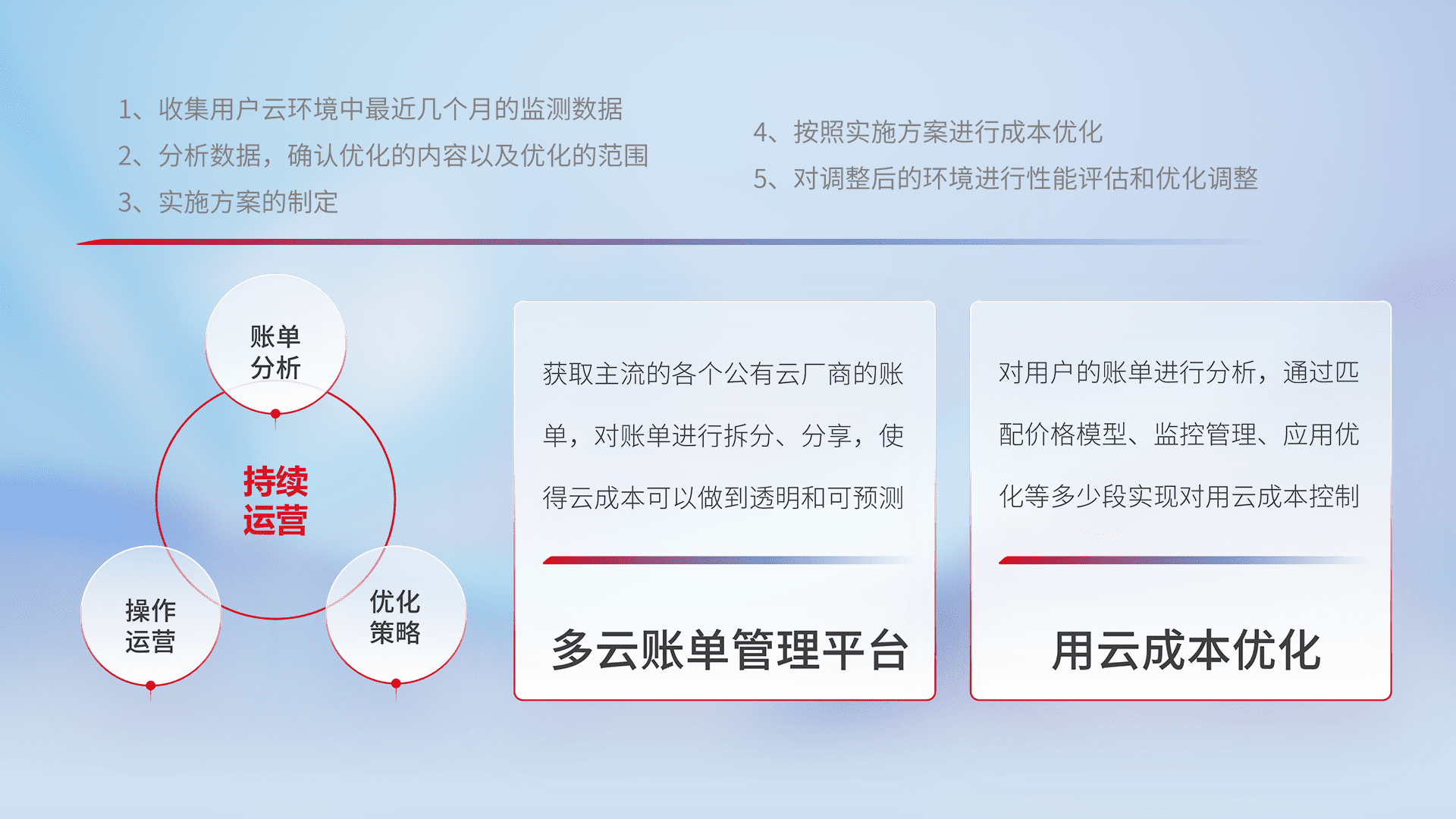 通过多云纳管,,,以统一的资源数据模型把客户的云资源进行抽象和封装,,,,进而实现对多云资源的统一操作,,保障云资源管理的可靠性、、稳定性与可用性。。量身定制化运维内容,,配置、、开发运维、、补丁管理、、备份、、、、监控、、、认证和访问管理、、、审计和日常巡检等,,保障在用云过程中的可靠度,,,,稳定度以及高可用率。。。。